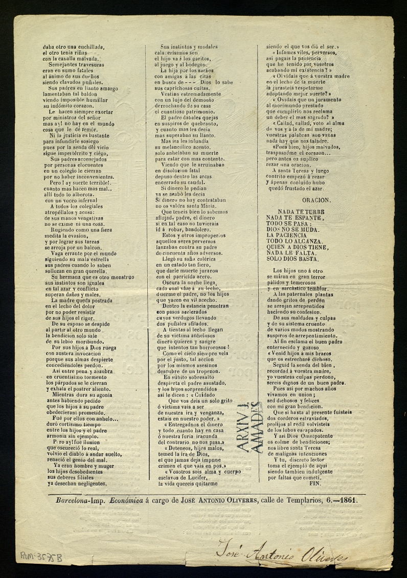 "Suceso milagroso que tuvo lugar en la ciudad de Barbastro por intercesion de santa Teresa fué libertado un padre el cual iba á ser víctima de las manos de sus mismos hijos los que viendo tal portento se árrepintieron volviendo por el sendero del bien".