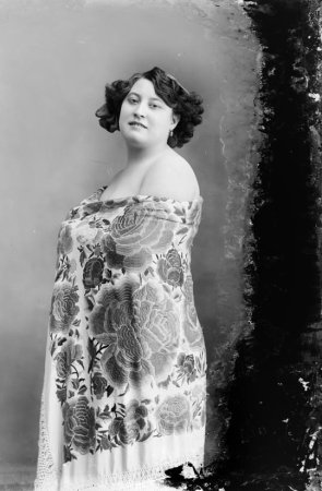 Retrat de tres quarts de cos de l'actriu Adela Margot, vesteix un mantó i deixa les espatlles al descobert.