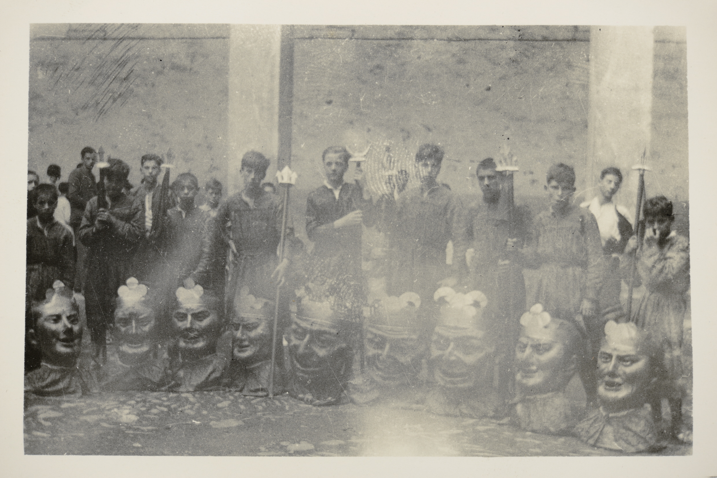 Fotografia d'un grup de joves portadors vestits igual que subjecten llances acabades en formes diverses. Als seus peus reposen els caps de cabeçut. Al centre de la imatge hi ha la marca d'una emprempta dactilar.