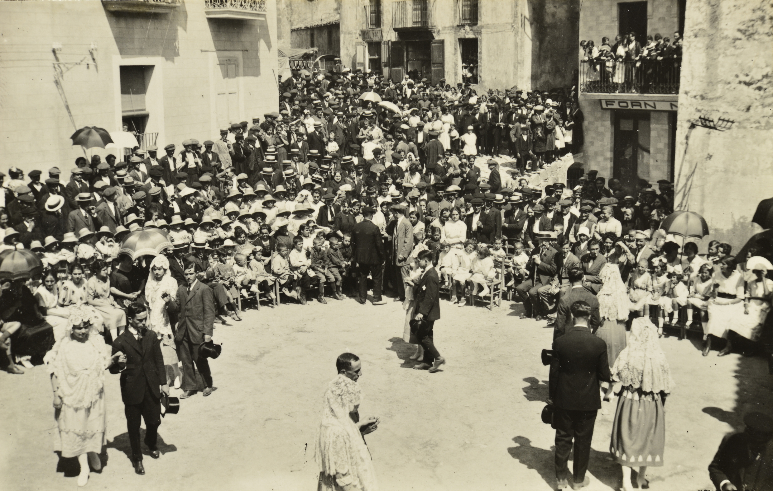 Fotografia de diversos intèrprets del ball del ciri formant una rotllana, resten a la plaça d'un poble plena de gent. / Revers d'una postal on posa: "Dansa de Castelltersol, Any 1921"