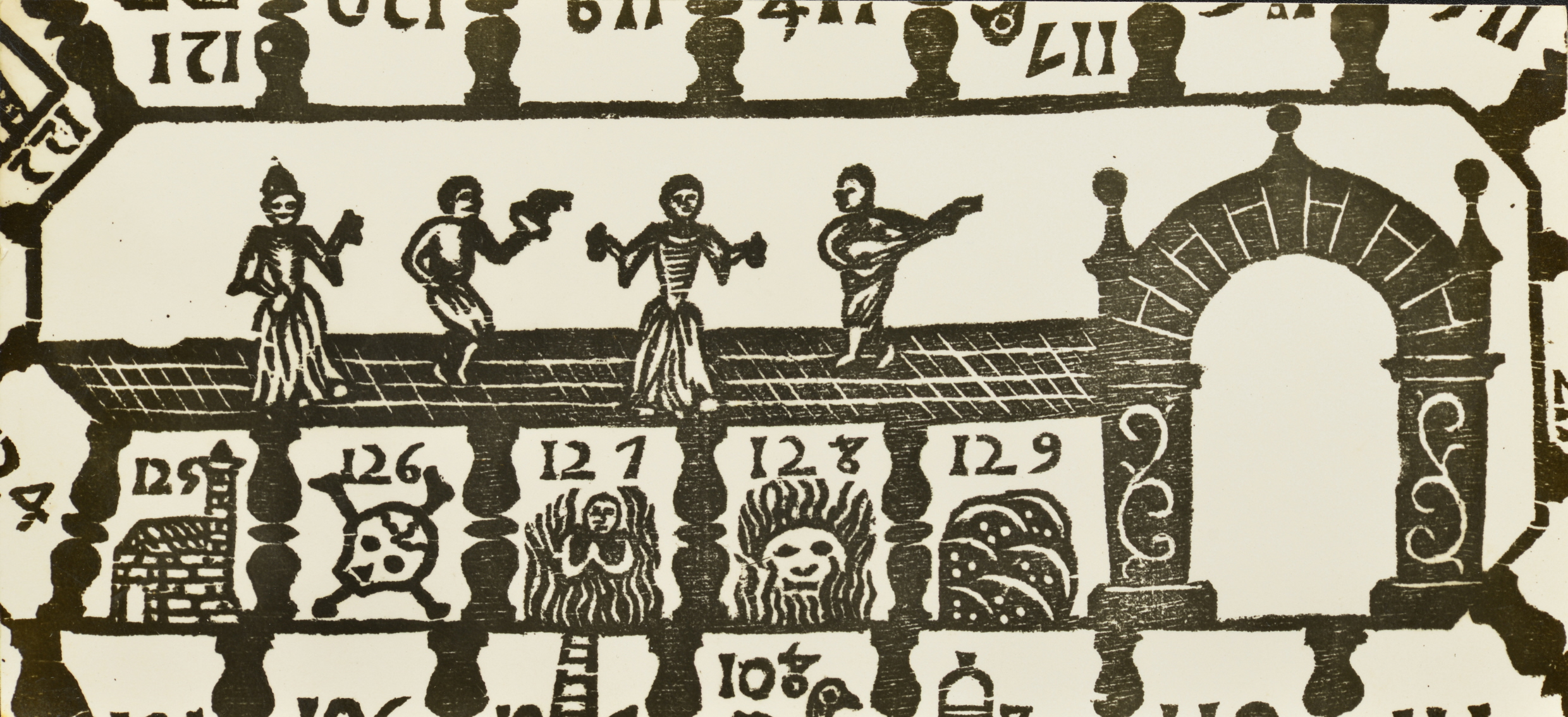 Fotografia d'un dibuix on aparèixen tres dansaires acompanyats d'un instrumentista de corda pinçada. Forma part d'un taulell. / Revers d'un document on posa: "Ball tres"
