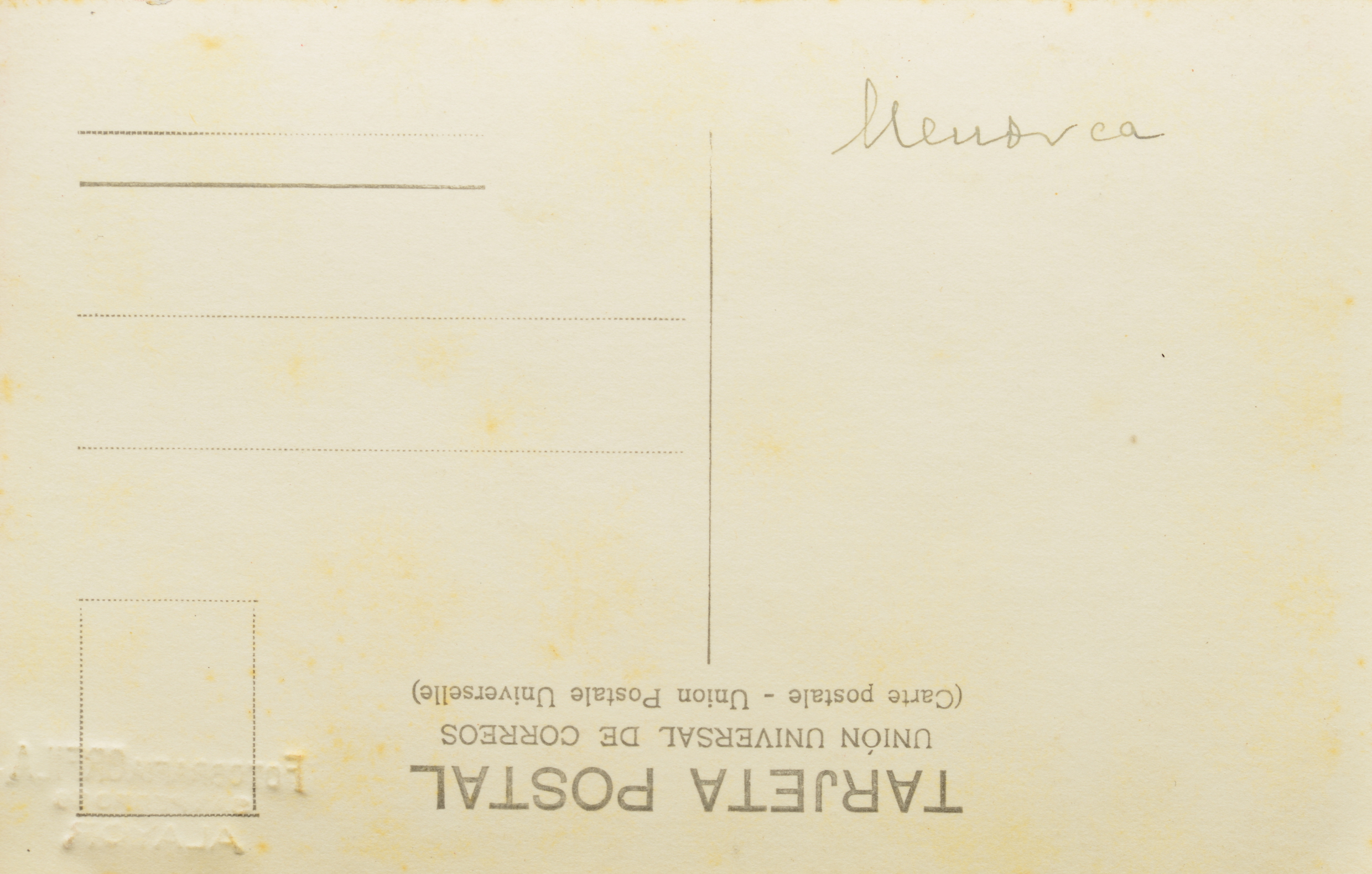 Fotografia aèria d'un poble. En bon estat. A la part superior esquerra posa "Alayor/Vista Parcial" mecanoescrit amb tinta blava. / Revers de la postal en el qual posa "Menorca" escrit a mà amb llapis.