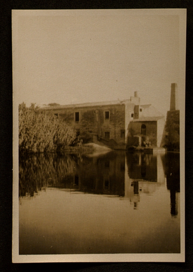 Fotografia d'un edifici a tocar d'un llac. Destaca una xemeneia a mà dreta de la imatge. / Revers d'una postal on es pot llegir: "Valls. Molí"