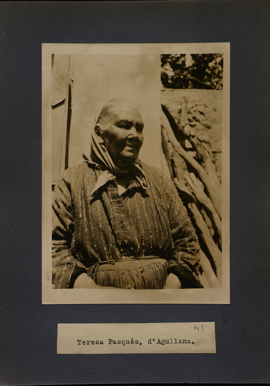 TOMÀS, Joan; AMADES, Joan. ([ent) "Teresa Pasqué, d'Agullana". Centre de Documentació de Cultura Popular. Trobem aquesta mateixa fotografia a la sèrie F (F-14_058). MASSOT i MUNTANER, Josep (1993-2011): Obra del Cançoner Popular de Catalunya. Materials vol. IX (p. 242). Barcelona: Publicacions de l’Abadia de Montserrat.. <http://hdl.handle.net/10687/449471>. [Consulta: ]