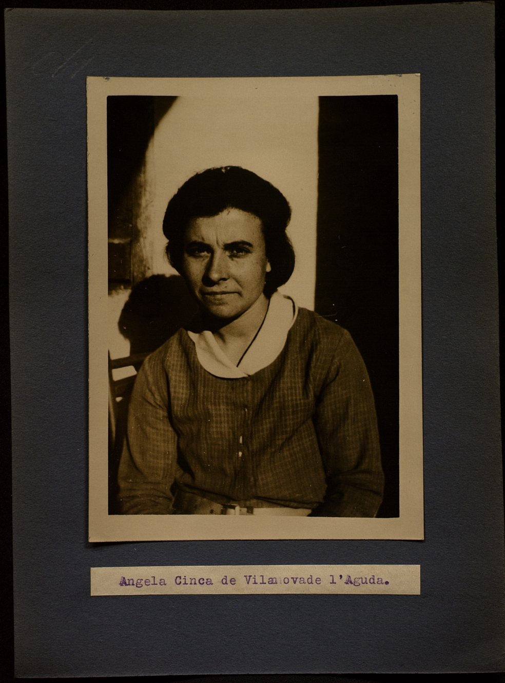 TOMÀS, Joan; AMADES, Joan. (1929) "Angela Cinca. Vilanova de l'Aguda". Centre de Documentació de Cultura Popular. Fotografia repetida en el document F-16_127. La imatge està enganxada en un paper amb un text a sota escrit amb màquina d'escriure; Massot i Muntaner, Josep (1993-2011): Obra del Cançoner Popular de Catalunya. Materials vol. XII. Barcelona: Publicacions de l’Abadia de Montserrat, pg 43. <http://hdl.handle.net/10687/450397>. [Consulta: ]