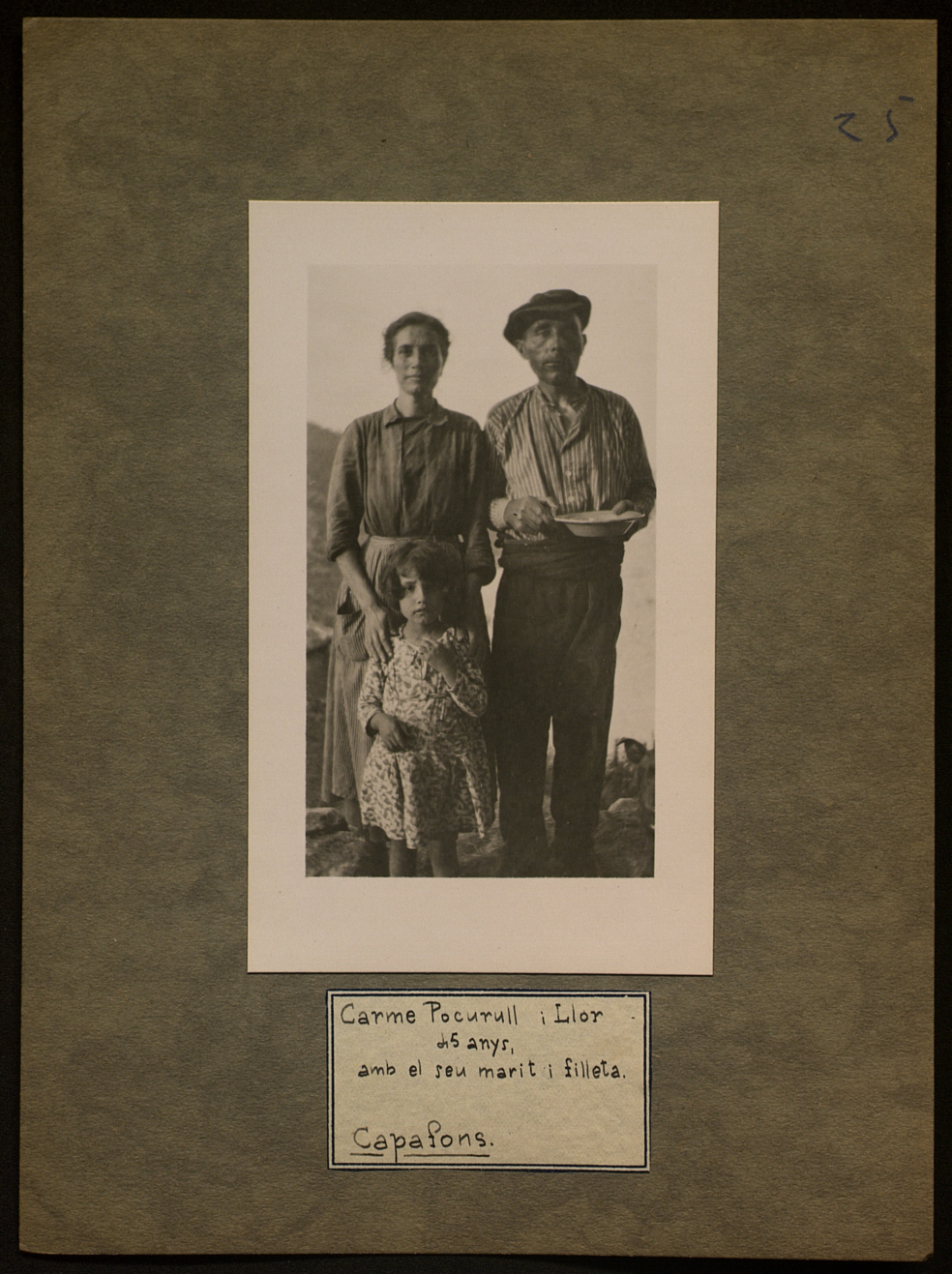 GOLS, Xavier; BRUNET, Antoni. ([ent) "Carme Pocurull i Llor amb el seu marit i filleta. Capafons". Centre de Documentació de Cultura Popular. La imatge està enganxada en un paper amb un text a sota escrit amb tinta negra; Informació extreta de C-158 pàgina 31 i 5.. <http://hdl.handle.net/10687/451130>. [Consulta: ]