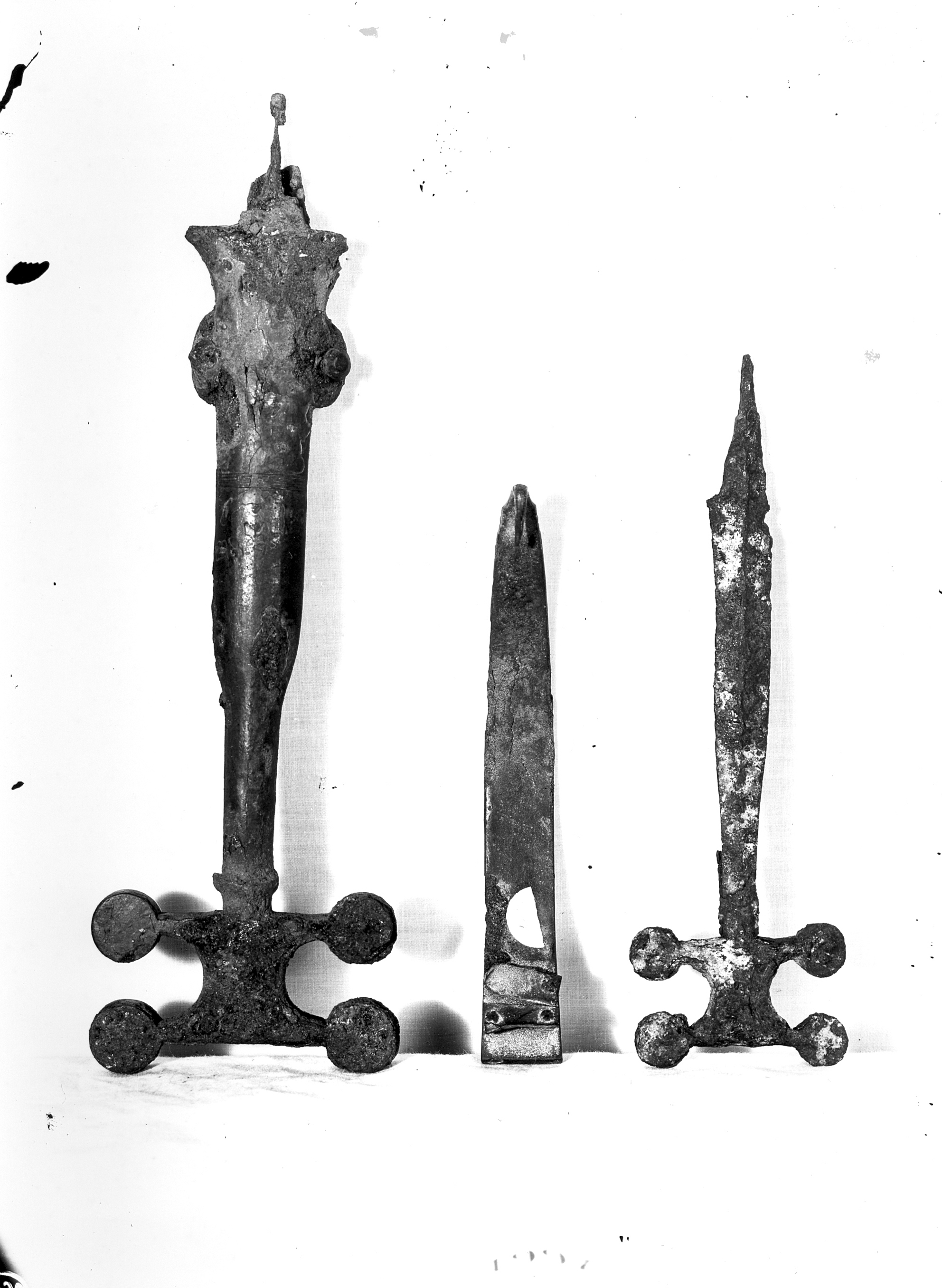 Tres peces metall ibèric, la peça de l'esquerra és una peça de cinturó, que presenta el cos allargat que es va fent més gruixut en la seva terminació. El seu cap presenta una placa on en cada punta té dos cercles, com a decoració. En el centre un punyal allargat amb la punta doblegada. A l'esquerra punyal que conserva la fulla en bon estat, una mica desgastada. i el mànec presenta la mateixa forma que el cinturó. Museo Arqueológico de Burgos. Exposició Internacional de Barcelona 1929. "El Arte en España", número 1997.
