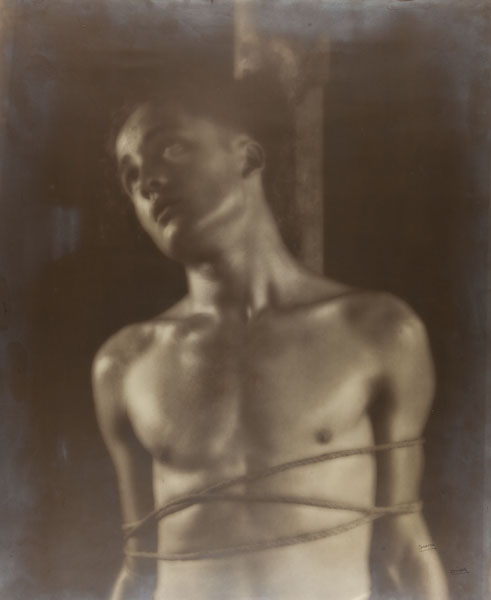 Tors d'un noi lligat a un pal i amb el cap inclinat.