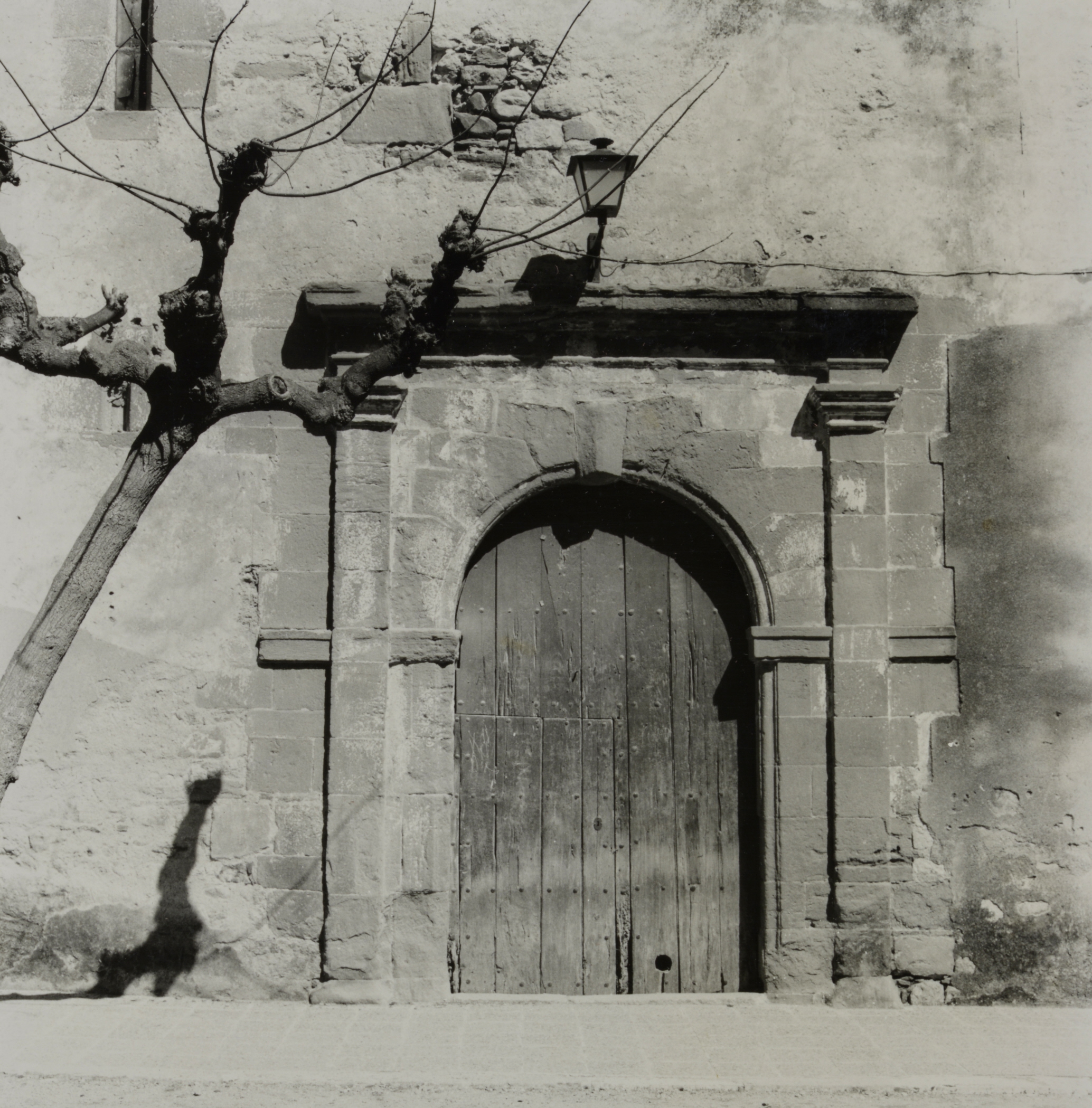 Vista frontal de la portada d'accés d'arc de mig punt flanquejada per dues pilastres amb entaulament pla